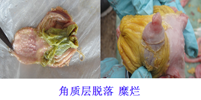 谷鳳柱教授還說,肌胃炎多和腺胃炎同時發(fā)生,但也可單獨發(fā)生,且對雞的危害大于腺胃炎。由于病因不同,臨床肌胃角質(zhì)層的病理變化也不盡相同。臨床上經(jīng)??吹郊∥附琴|(zhì)層的糜爛、崩解一定是發(fā)生了肌胃炎,但角質(zhì)層沒有糜爛不一定不是肌胃炎,要認(rèn)真辯證分析。如果發(fā)現(xiàn)角質(zhì)層已經(jīng)發(fā)生褪色、變淡,那么我們就應(yīng)該注意了。